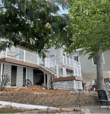 Cozy lakeside deck with comfortable chairs and a fire pit glowing in the evening.
